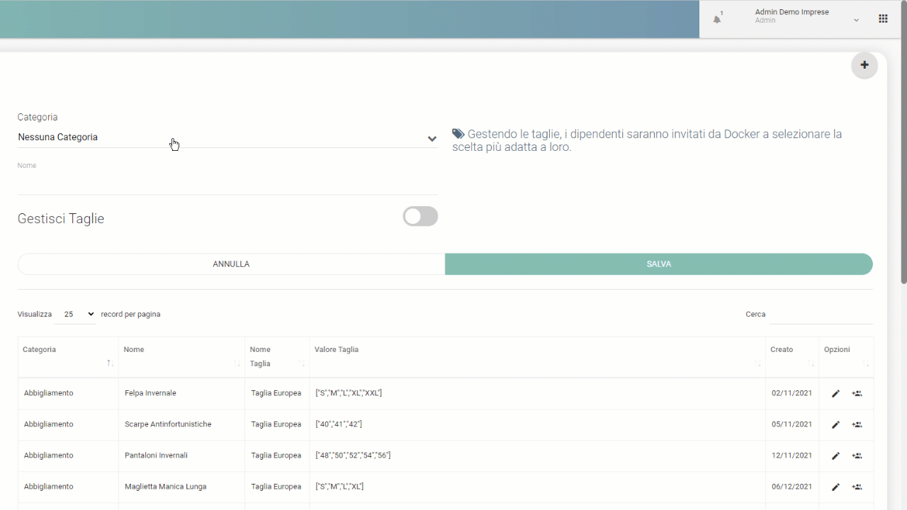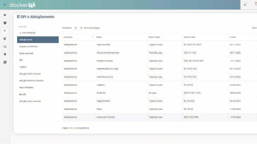 Docker ti consente di monitorare i fabbisogni a livello di taglie o assortimento che vuoi determinare per ogni tipo di bene aziendale